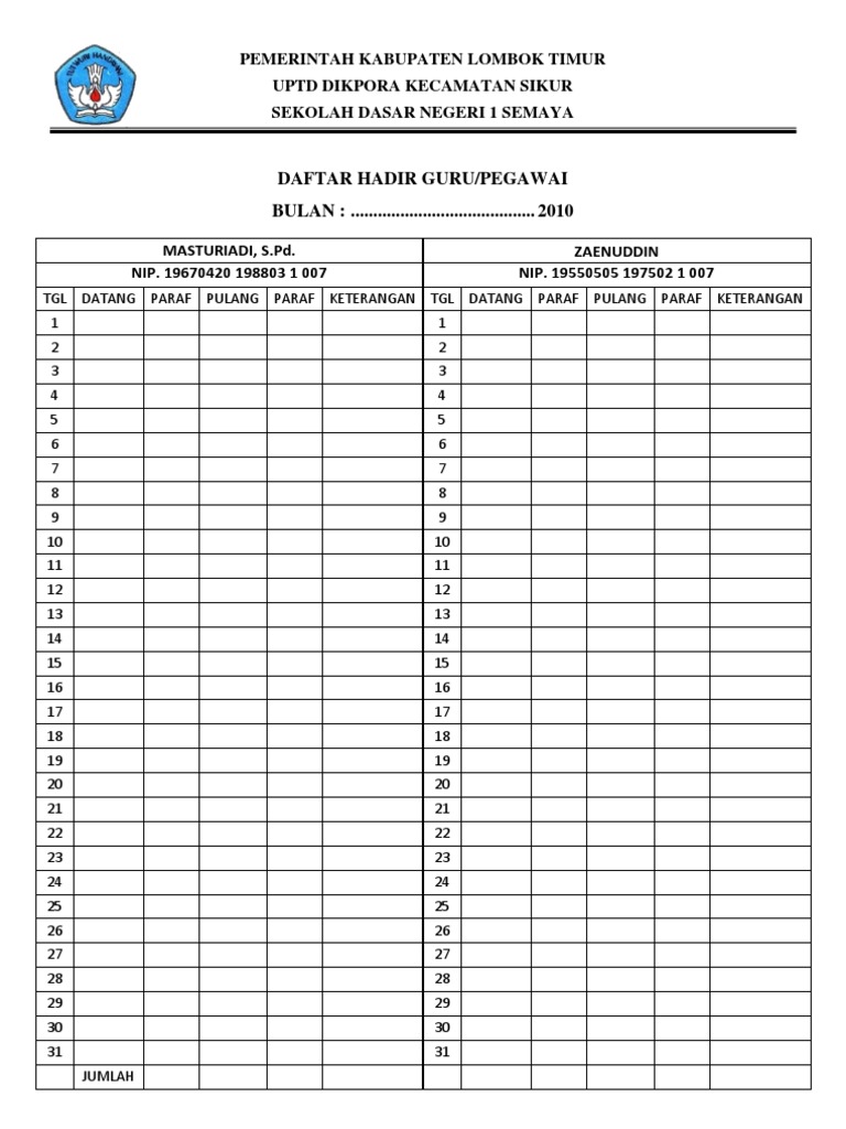 Format Daftar Hadir Dan Laporan Capaian Kinerja Harian Guru Pegawai Madrasah Info Kemenag from infokemenag.web.id Oct 28, 2020 · absensi kehadiran guru atau disebut juga daftar hadir guru merupakan media untuk mencatat kehadiran guru pada satuan pendidikan. Dec 09, 2020 · download daftar hadir guru dan tenaga kependidikan. A2.rekap daftar absensi guru di kelas. Tujuan dibuatnya absensi yaitu untuk memenuhi administrasi sekolah berkaitan dengan kepegawaian, juga sebagai suatu cara untuk mengecek tingkat kehadiran guru di sekolah berdasarkan pada jadwal kerjanya. Jun 04, 2021 · format daftar hadir dan daftar nilai siswa untuk guru di dalam format penilaian yang akan saya bagikan ini telah memuat daftar nilai harian berupa tugas sesuai dengan kompetensi dasar dari penilain guru setiap mata pelajaran dan juga memuat daftar penilaian ulangan harianulangan tengah semesternilai ulangan semester dan nilai akhir raport. Dibuat dalam 3 file yaitu pdf, excell dan doc ms word. Selain menjadi pelengkap data sekolah, contoh format daftar hadir. File download daftar hadir kegiatan kkg oleh pengurus kkg.